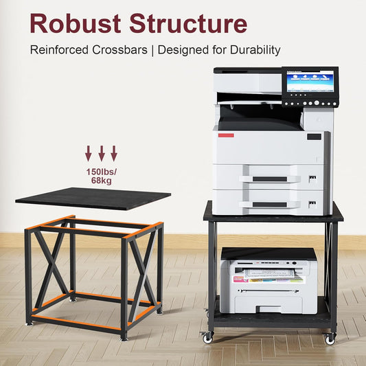 2 Tier Large Printer Stand, 23.6 x 23.6 Inches Printer Table with Storage Shelf, Rolling Printer Cart with Industrial Wheels for Home Office (Black)