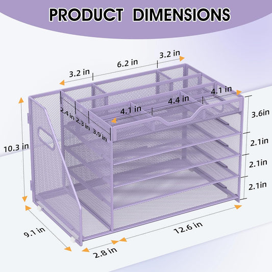 5 Tier Paper Letter Tray with File Holder and 3 Drop-in Pen Holders, Mesh Desk File Organizer with Handle, Desk Organizers and Accessories for School,Home, Office Supplies Storage-Purple