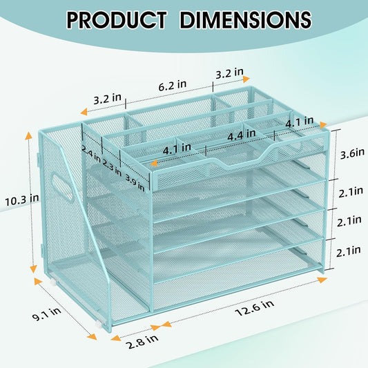 5 Tier Paper Letter Tray with File Holder and 3 Drop-in Pen Holders, Mesh Desk File Organizer with Handle, Desk Organizers and Accessories for School,Home, Office Supplies Storage-Blue
