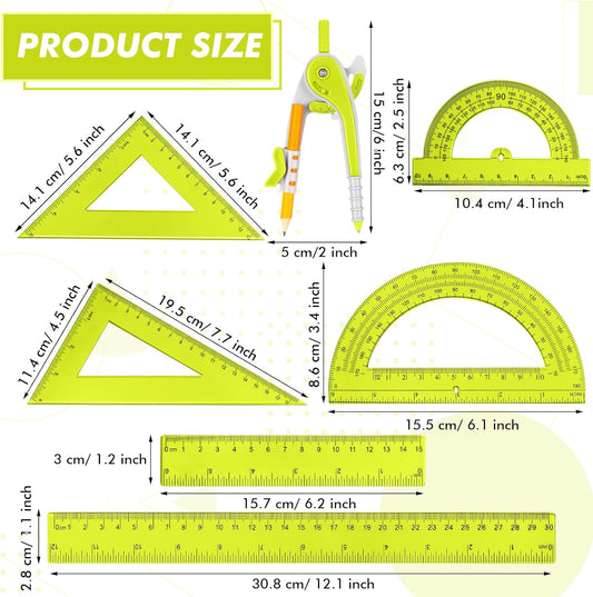 Zonon 1 Set Plastic Geometry Math Set 7 Pcs Includes 6'' / 4 '' Protractor, Drawing Compass, 45/60 Degree Triangle Rulers, 12'' / 6'' Math Ruler Transparent for Office Supplies(Yellow)