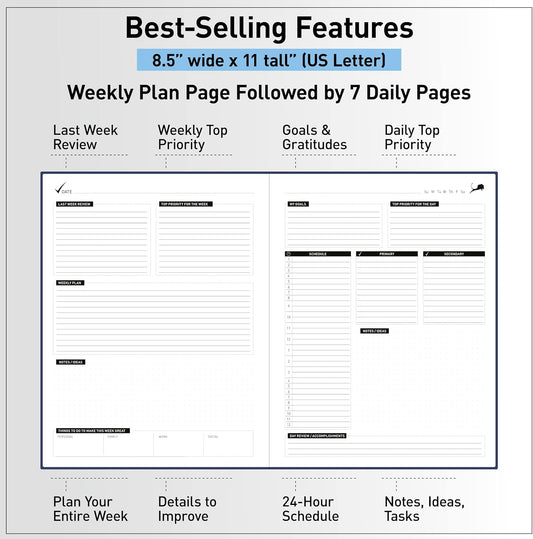 Daily Planner - Professional Life Planner, Calendar & Gratitude Journal to Increase Productivity, Time Management & Happiness - Vegan Leather Softcover, 6 Months, Undated 24 Hour Business Planner