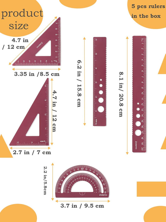 Metal Geometry Set, 5-Piece Aluminum Ruler, Math Drafting Ruler Kit Includes Protractor, Triangle Rulers, Straight Rulers-Math Measurement Tools for School and Office Supplies (Plum Red)