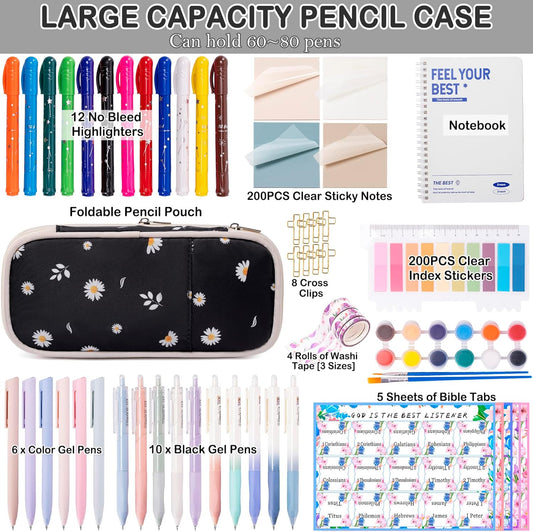TuErCao Bible Study Supplies Kit - Black Daisies Aesthetic Pencil Pouch Bag, 75 Durable Tabs, 12 Smooth Crayon Highlighters, 16 Gel Pens, Notebook, Notes -Bible Journaling Study Tools