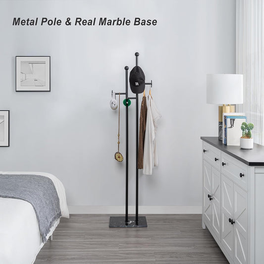 Coat Rack with Natural Marble Base, Metal Freestanding Coat Rack with 8 Hooks, 3 Adjustable Size Sturdy Coat Tree for Bags, Coats, and Hats for Entryway, Hallway, Bedroom, Office, Black