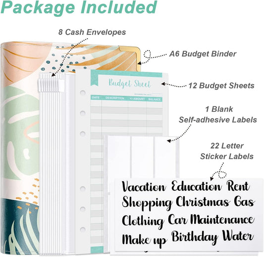 Rnivvi Budget Binder with Zipper Envelopes, A6 Money Saving Binder Cash Envelopes for Budgeting, PU Leather Planner Money Organizer for Cash Stuffing Planning, Cute System Wallet for Women Men, Beach
