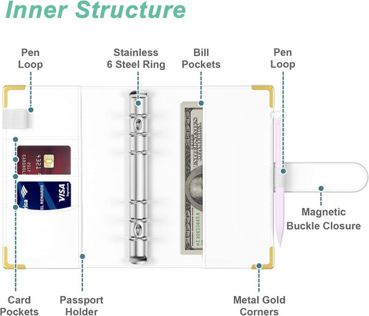 Rnivvi Budget Binder with Zipper Envelopes, A6 Money Saving Binder Cash Envelopes for Budgeting, PU Leather Planner Money Organizer for Cash Stuffing Planning, Cute System Wallet for Women Men, White