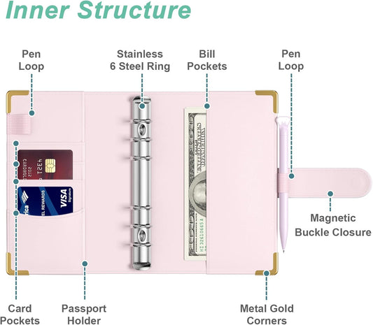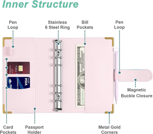 Rnivvi Budget Binder with Zipper Envelopes, A6 Money Saving Binder Cash Envelopes for Budgeting, PU Leather Planner Money Organizer for Cash Stuffing Planning, Cute System Wallet for Women Men, Pink