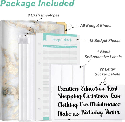 Rnivvi Budget Binder with Zipper Envelopes, A6 Money Saving Binder Cash Envelopes for Budgeting, PU Leather Planner Money Organizer for Cash Bills, Cute Marble System Wallet for Women, Gray White