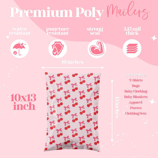 10x13 Designer Poly Mailer 100 Pack Heavy Duty Waterproof Self Seal Shipping Bags for Small Business Large Mailing Envelopes Bulk Tear Resistant Packaging Pink Stripe Cherry Fruit