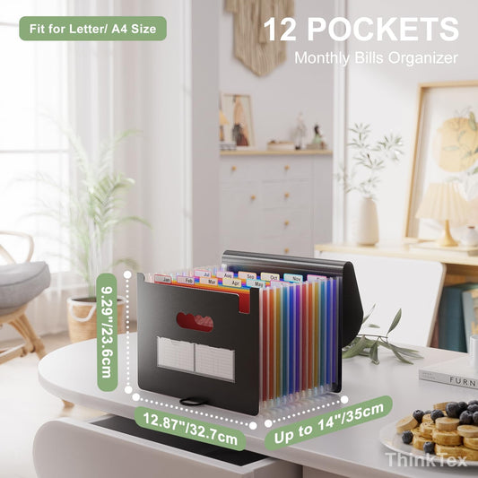 ThinkTex Accordion File Organizer, 12 - Pocket Expanding File Folders for Paper Receipts, Bills&Taxes Organizer, Letter/A4 Size Document Holder for School, Office, Home with Colorful tabs- Black