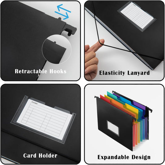 TRANBO 7-Pockets Hanging File Folder with Retractable Hooks for Filing Cabinet, Letter Size Expandable Accordion File Organizer with Elastic Band for File Frame or On-The-Go Use (1 Pack)