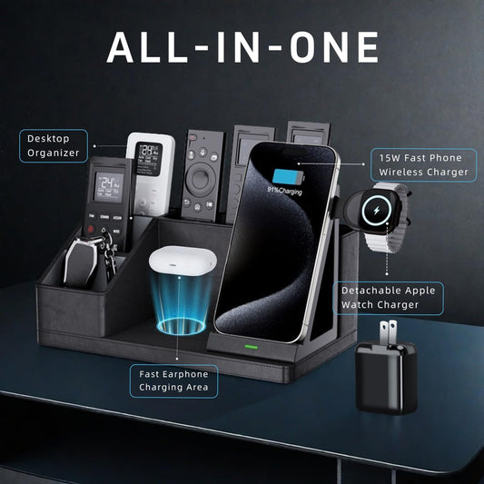 GORESE Leather Desk Organizer with Charging Station, 4 in 1 Nightstand Organizers for Remote Control Pen Holder, Desktop Accessories Workspace Organizers for Office Supplies