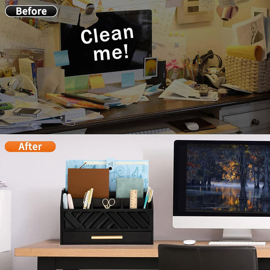 Black Wood Desk Organizer and Accessories with Drawer, Bill Mail Organizer and File Mail Holder for Office Supplies, Modern Desk Accessories & Workspace Organizers for Desk Organization