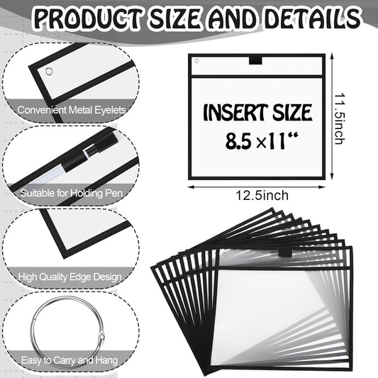 Teling 150 Pcs Dry Erase Pockets Bulk Reusable Job Ticket Holders Clear Plastic Sleeve Protector Work Order Sleeve Shop Ticket Holder for Welcome Teacher Back Office Supplies(11.5 x 12.5'',Black)