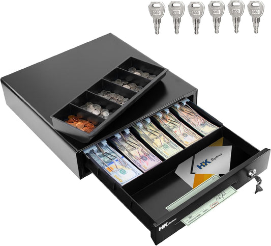 HK SYSTEMS 16" Heavy Duty Black POS Cash Drawer with 5Bill/5Coin, Removable Coin Compartment ONLY, 24V, RJ11, Single Large Front Media Slots, Black
