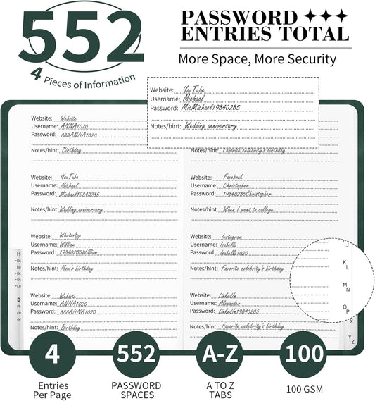 Elegant Password Book with Alphabetical Tabs - Hardcover Password Book for Internet Website Address Login - 7" x 10" Password Keeper and Organizer w/Notes Section & Back Pocket (Green)