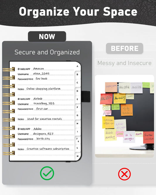 Elegant Password Book with Alphabetical Tabs - Hardcover Password Book for Internet Website Address Login - 7" x 10" Password Keeper and Organizer w/Notes Section & Back Pocket (Black)