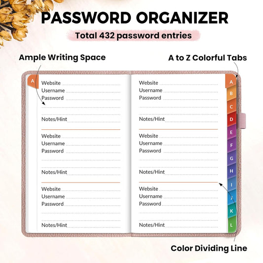 Password Book with Individual Alphabetical Tabs Laminated, Large Print Password Keeper Book for Seniors, A5 Hardcover Internet Password Log Book to Record Website Login Details - Bloom