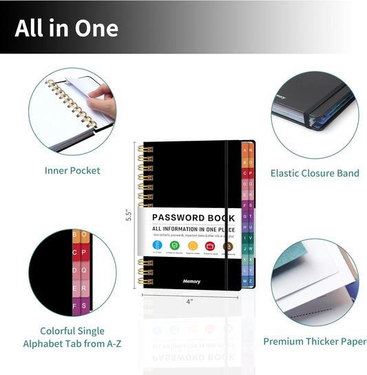 Password Book with Alphabetical Tabs, Hardcover Password Keeper, A5 Size 8.3"x6" Password Notebook for Saving Internet Login, Username, Password Organizer for Computer & Website Logins(Black)