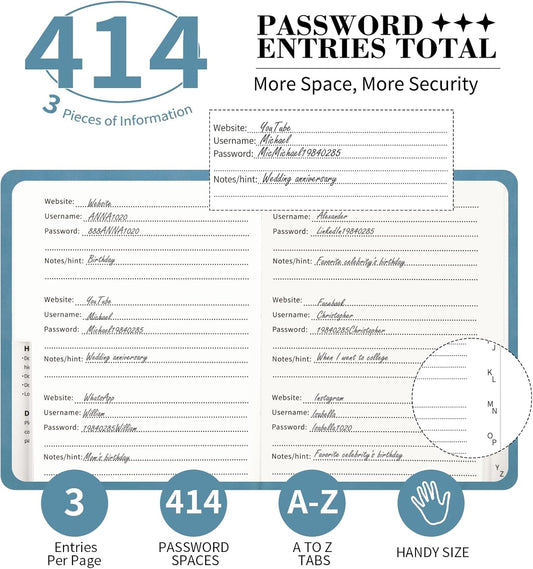 Password Book with Alphabetical Tabs, Hardcover Password Keeper, A5 Size 8.3"x6" Password Notebook for Saving Internet Login, Username, Password Organizer for Computer & Website Logins, Blue