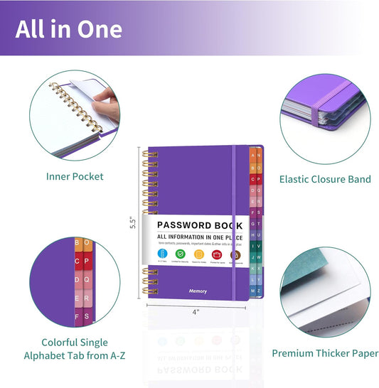 WEMATE Password Book with Alphabetical Tabs, Spiral Password Keeper Book for Seniors, Internet Password Notebook Password Journal Logbook Log in Detail, Small – 4.7''x 6'' (Purple)