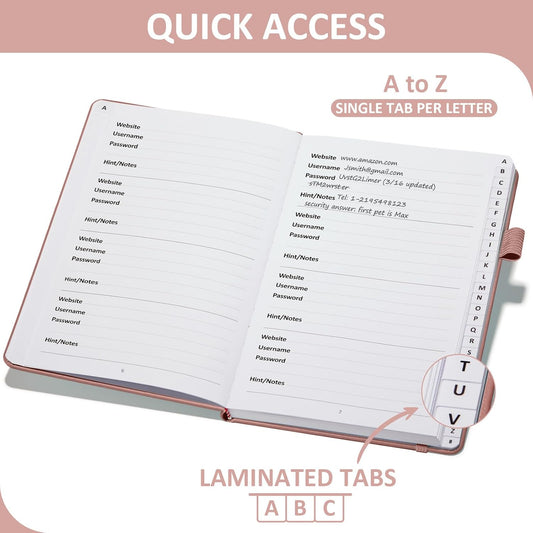 Password Book with Individual Alphabetical Tabs Laminated, Large Print Password Keeper Book for Seniors, A5 Hardcover Internet Password Log Book to Record Website Login Details - Rose Gold