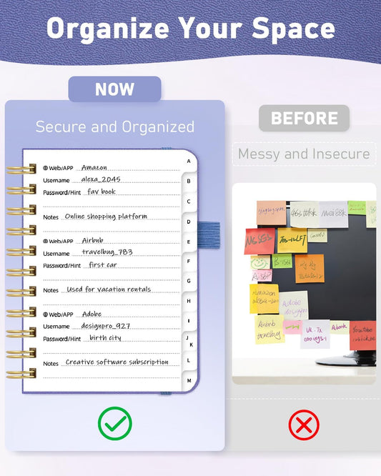 JUBTIC Password Book with Individual Alphabetical Tabs, 7"x10" Internet Password Keeper Book for Seniors, Password Notebook and Organizer/Notes Section,Purple