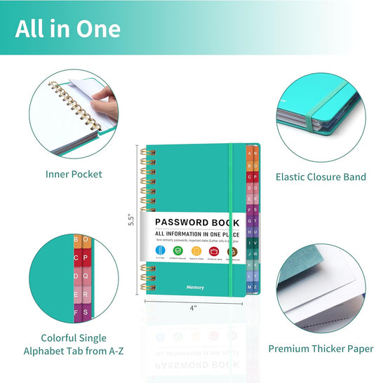 WEMATE Password Book with Alphabetical Tabs, Spiral Password Keeper Book for Seniors, Internet Password Notebook Password Journal Logbook Log in Detail, Small – 4.7''x 6'' (Teal)