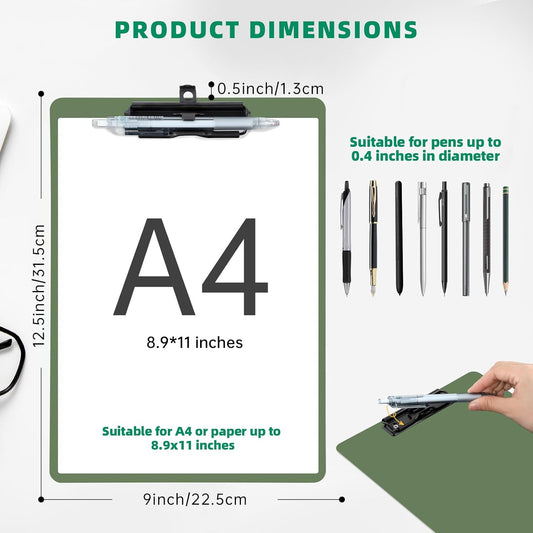 Clipboard with Pen Holder, 2 Pack Plastic Clipboard with Low Profile Metal Clip, Hanging Clip Boards Holds 8.5x11 Inch Papers, Standard A4 Letter Size Clip Boards for Offices & School, Green