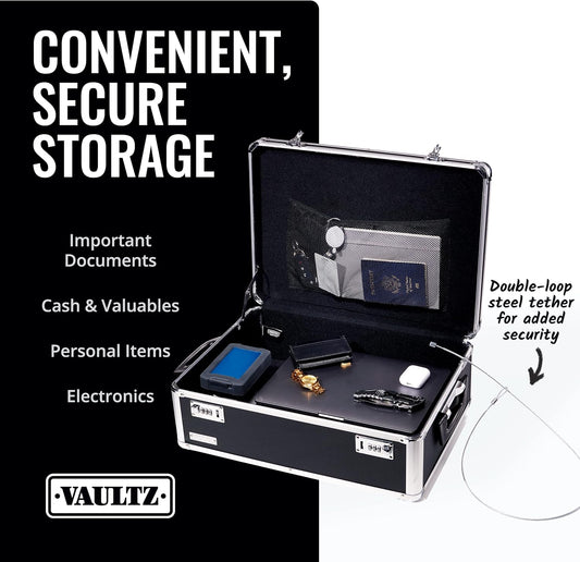 Vaultz Storage Lock Box - 6.5 x 19.25 x 13.5 Inch Lockable Dorm Storage Trunk with Combination Lock - Briefcase, Medicine Box, Lock Boxes for Personal Items, Cash, Laptop - Black on Black