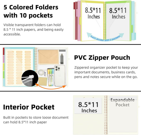 Ospelelf Leather Clipboard Folio with with Storage Zipper Pouch, Spiral Clipboard Folder with Notepad for Letter Size, 5 Folders with 10 Pockets, 39 Divider Label Stickers (Beige)