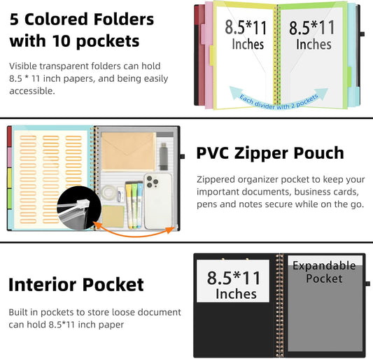 Ospelelf Leather Clipboard Folio with Notepad for Letter Size, Spiral Clipboard Folder with Storage Zipper Pouch, 5 Folders with 10 Pockets, 39 Divider Label Stickers, Pen Loop Series (Black)