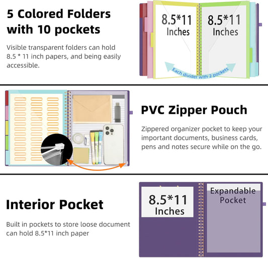 Ospelelf Leather Spiral Clipboard Folder with Storage Zipper Pouch, Foldable Clipboard Folio with Notepad for Letter Size, 5 Folders with 10 Pockets, 39 Divider Label Stickers (Purple)