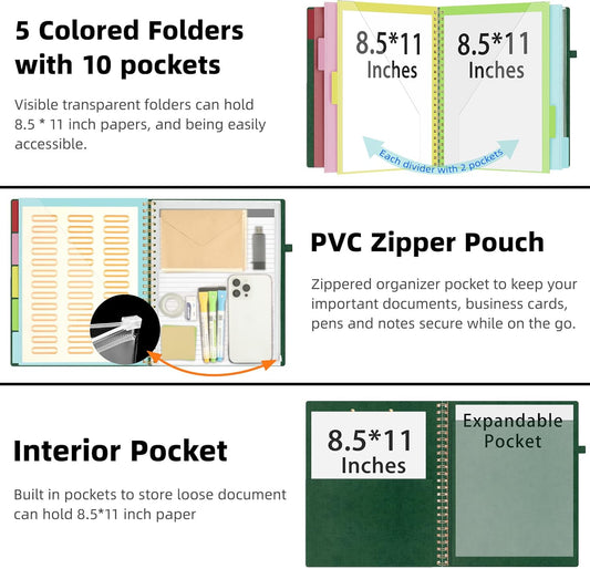Ospelelf Leather Clipboard Folio with Notepad for Letter Size, Spiral Clipboard Folder with Storage Zipper Pouch, 5 Folders with 10 Pockets, 39 Divider Label Stickers, Pen Loop Series (Green)