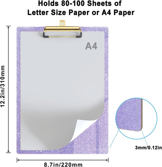 Glitter Acrylic Clipboard Decorative Standard A4 Letter Size 12.2" x 8.7", Fashion Bling Clip Boards with Designed Low Profile Gold Clip for Classroom Office - Purple