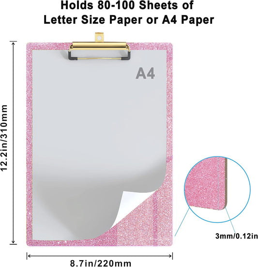Glitter Acrylic Clipboard Decorative Standard A4 Letter Size 12.2" x 8.7", Fashion Bling Clip Boards with Designed Low Profile Gold Clip for Classroom Office - Warm Pink