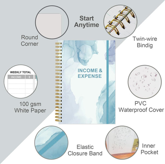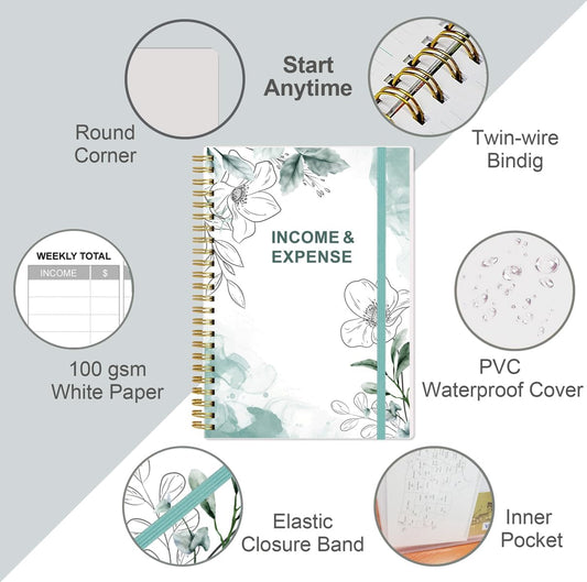 Heveboik Income & Expense Log Book - A5 Income and Expense Tracker for Small Business, Accounting Bookkeeping Tracking for Woman and Man, 5.8" x 8.3", Teal Watercolor