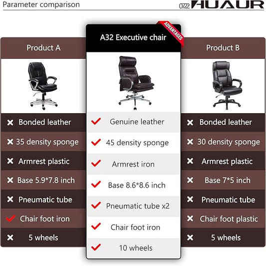 Genuine Leather Modern Executive Chair High-Back Support 90 to 150 Degrees Tilt and Upholstered Home Desk Chair with Base 360LB Capacity Swivel Computer Office Chair (Brown)