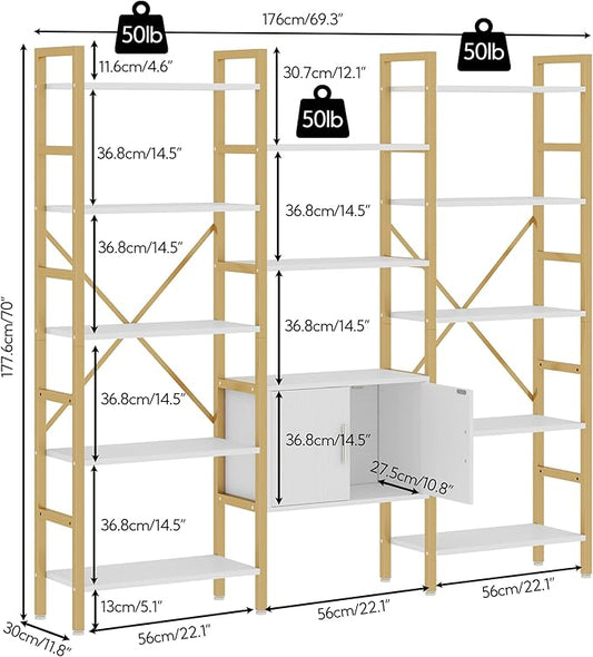 Yusong Bookshelf Triple Wide 5 Tier Bookcases with Storage Cabinet, Industrial Large Modern Tall Bookshelves with 12 Open Display Shelves for Living Room Office Bedroom, White and Gold