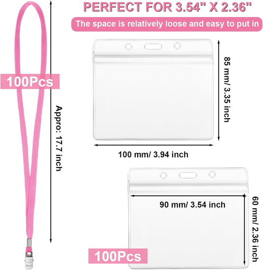 Marspark 100 Sets Clear Name Tags with Lanyard, Lanyards for ID Badges Reusable Strap with ID Holder Plastic Name Badges for Adults Business School Church Conference (Pink)
