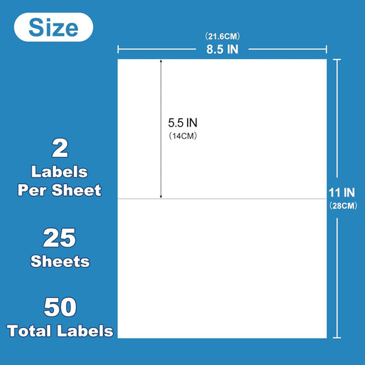 Half Sheet Self Adhesive Shipping Labels for Laser & Inkjet Printers 8.5" x 5.5", White Blank Mailing Labels Strong Adhesive Sticker Labels (25 Sheets,50 Labels)(HB-R002)