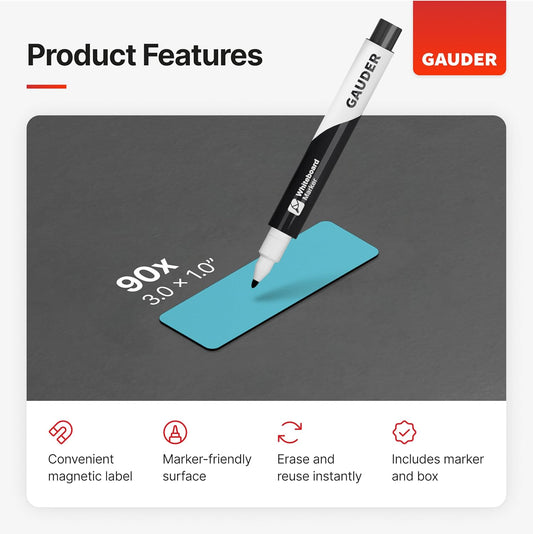 GAUDER Magnetic Dry Erase Labels | 90x Magnetic Labels (3 Inches x 1 Inch) | Dry Erase Magnets for Classroom, Whiteboard and Blackboard