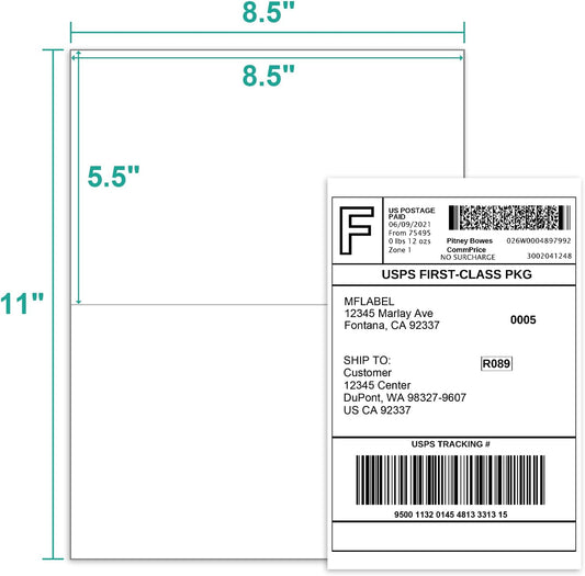 MFLABEL Half Sheet Shipping Labels 2-UP (100 Labels, 8.5"x5.5") - Round Corner Laser/Inkjet Labels for FedEx, UPS, Amazon FBA Strong Adhesion Corrugated Box Labels