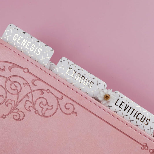 UPAFEXXI-Laminated Bible Tabs for Women and Men (Gold Foil Embossed Lettering) Reposition Large Print tabs, Easy to Read and Apply, 80 Bible Chapters Labels for Easy Navigation(Pink and White)