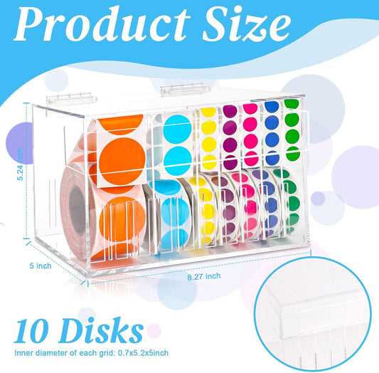 10 Disks Adjustable Label Dispenser with Lid 7.7 * 5.5 * 5.2 Inches Acrylic Sticker Dispenser Sticker Roll Holder for Holding Multi-Label Sticker Tape Date Markers Label Office (Not Include Sticker)