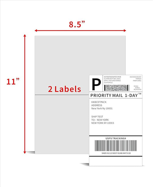 KKBESTPACK Half Sheet Shipping Labels for Laser and Inkjet Printers – 2 Per Page Self Adhesive Mailing Labels – White 8.5 x 5.5 (50 Labels)