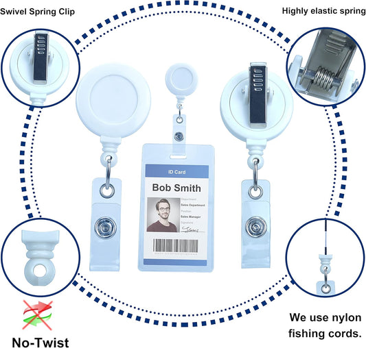 Badge Reels Retractable Badge Holder with Clip, Id Clips for Badges, Id Badge Reel, Retractable Id Badge Clip with Clear Vinyl Strap & Alligator Swivel, No Twist Dispenser (White)