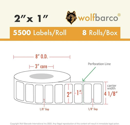 Direct Thermal Paper Label/Industrial Grade 2"X 1" White, with Perforation, 3" Core, 8" OD,5500 Labels/Roll (8 Rolls per Box), Compatible with Zebra, Godex and Datamax Printers