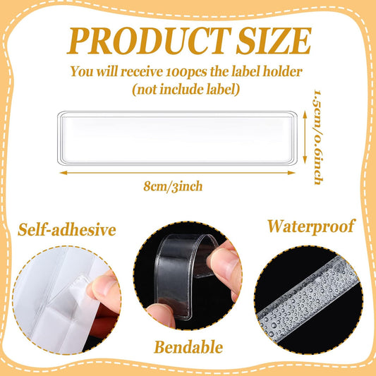 Jeyiour 100 Pcs Label Holders Adhesive Nameplate Pockets Storage Bin Labels Index Card Holder Shelf Plastic Peel Stick for Classroom Supermarket Bookshelf Library Student Box Drawer (3 x 0.6 Inch)