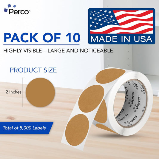 Perco Kraft Brown 2-Inch Perforated Circle Dot Sticker Labels — 10 Rolls, 5,000 Round Stickers — Natural, Cardboard-Like Surface with Permanent Adhesive for Organizing, Crafting & More—Made in USA